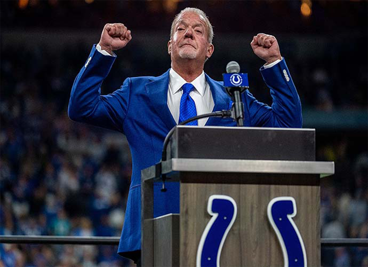 INDIANAPOLIS, IN - NOVEMBER 10: Indianapolis Colts owner Jim Irsay reacts to applause during Dwight Freeney"u2019s induction in the team"u2019s Ring of Honor during halftime of the game against the Miami Dolphins at Lucas Oil Stadium on November 10, 2019 in Indianapolis, Indiana. (Photo by Bobby Ellis/Getty Images)