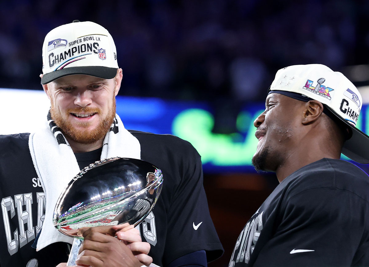 SANTA CLARA, CALIFORNIA - FEBRUARY 08: Sam Darnold #14 and Kenneth Walker III #9 of the Seattle Seahawks celebrate with the Vince Lombardi Trophy after winning Super Bowl LX against the New England Patriots at Levi's Stadium on February 08, 2026 in Santa Clara, California. The Seattle Seahawks defeated the New England Patriots 29-13. (Photo by Kevin C. Cox/Getty Images)
