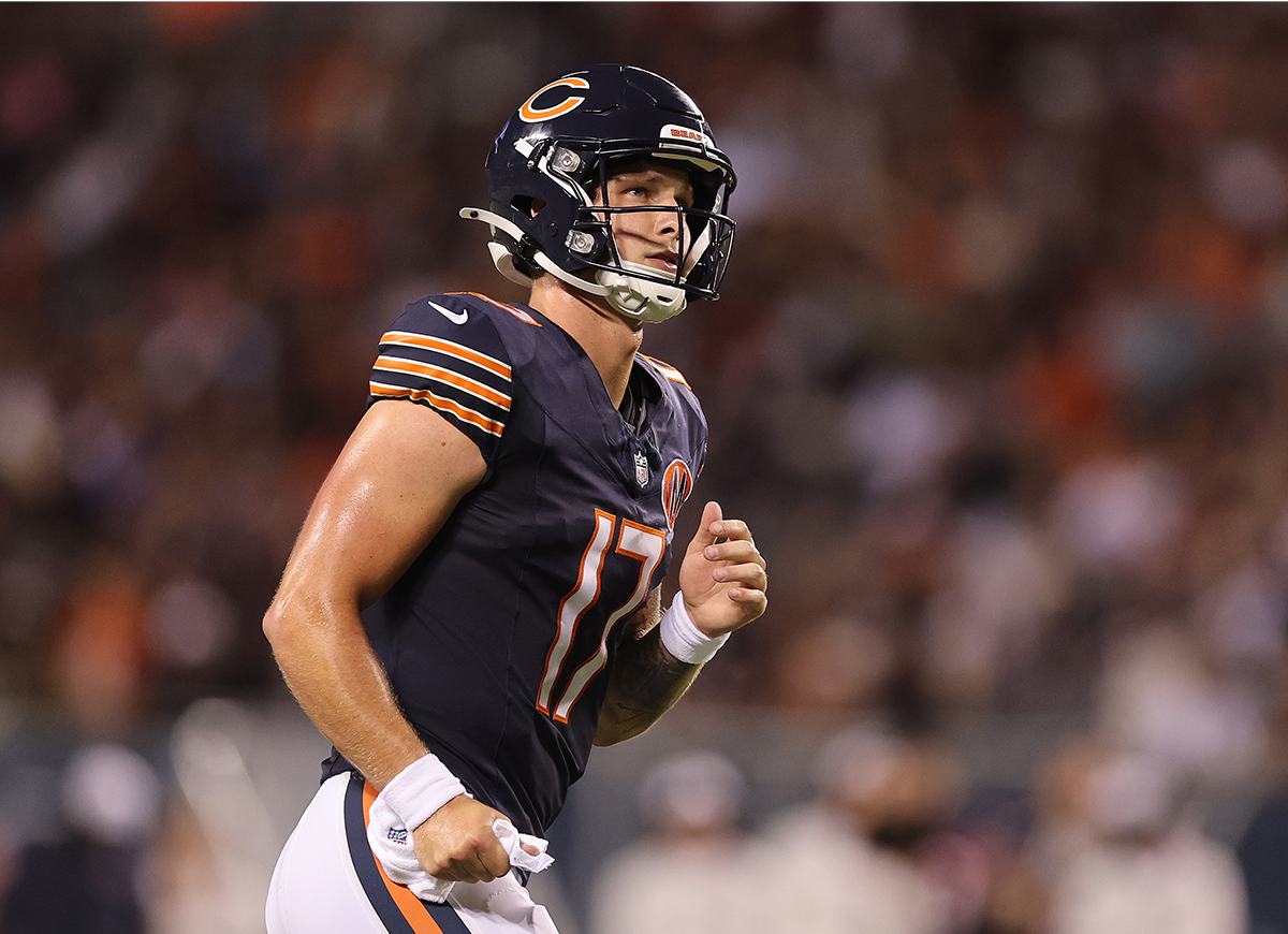CHICAGO, ILLINOIS - AUGUST 17: Tyson Bagent #17 of the Chicago Bears looks on against the Buffalo Bills during the NFL Preseason 2025 game between Buffalo Bills and Chicago Bears at Soldier Field on August 17, 2025 in Chicago, Illinois. (Photo by Michael Reaves/Getty Images)